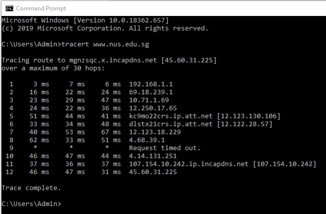 Using the command prompt and typing tracert http://www.nus.edu.sg had 12 hops.