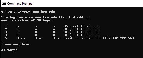 Using the command prompt and typing tracert http://www.ksu.edu had 5 hops.
