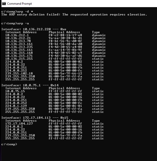 The command prompt arp -d* command was not allowed to work. Dr. Gx told me that this was probably only accessible to System Administrators.