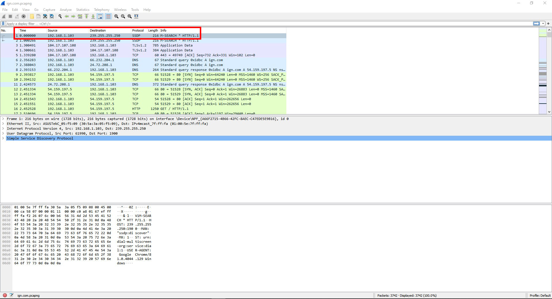 The first activity I did was to go to a website outside of my network. I went to ign.com . The second activity I did was releasing my IP address, the third was renewing my IP address. The fourth activity I did was a ping test with my router. The final activity I did was do a tracert for www.nus.edu.sg . I did this because I was curious to see what Wireshark would show when doing a tracert.