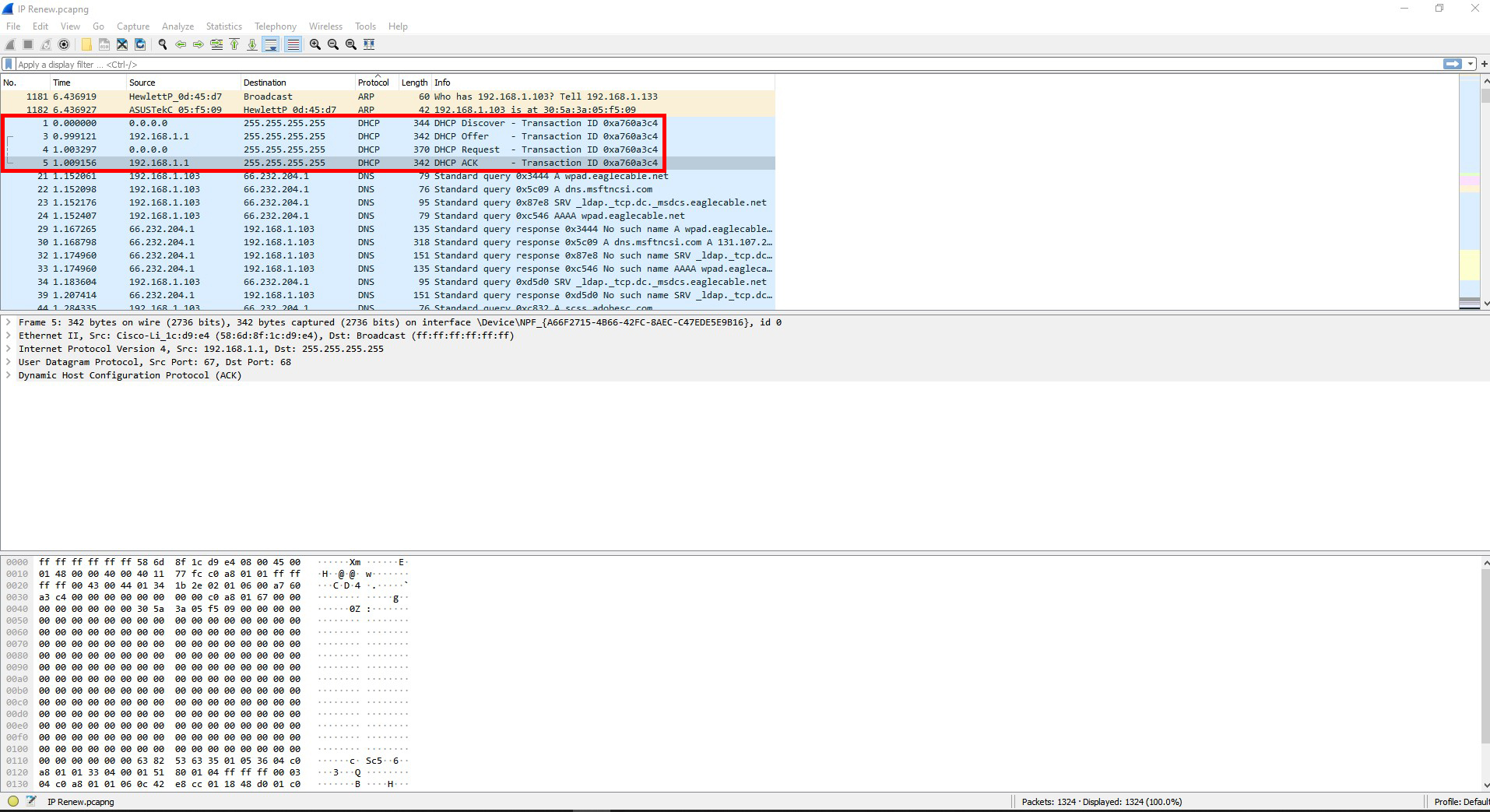 Question #10: Find the frames that show DHCP configuring IP addresses. What is the process for a machine to be assigned an IP address using DHCP? ((Look up “DHCP handshake” online to compare what you see & what is expected.).)
