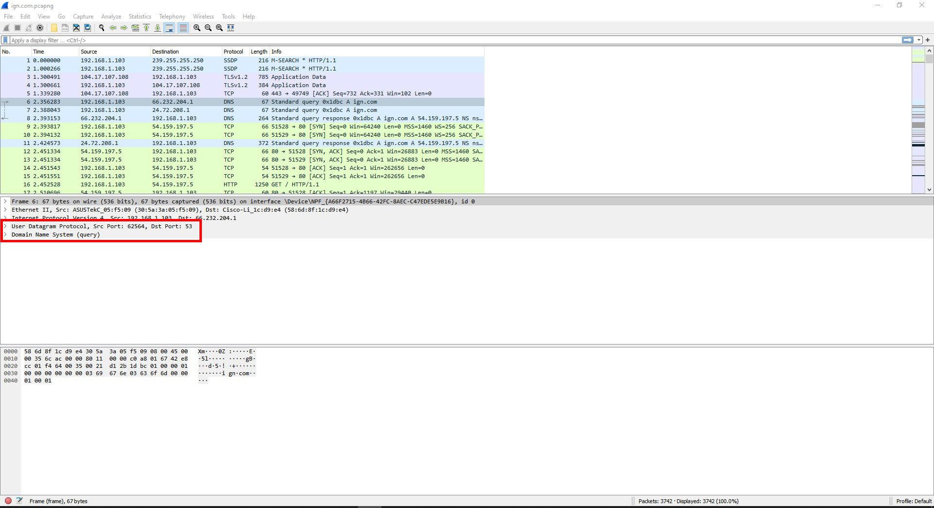 I clicked on a DNS packet and there was 2 things that were different. The 1st was that instead of having a TCP header, it had a UDP header. The 2nd thing was that it had a DNS query in it that the TCP frame did not have. The details for the IPv4 and Ethernet II were different also.