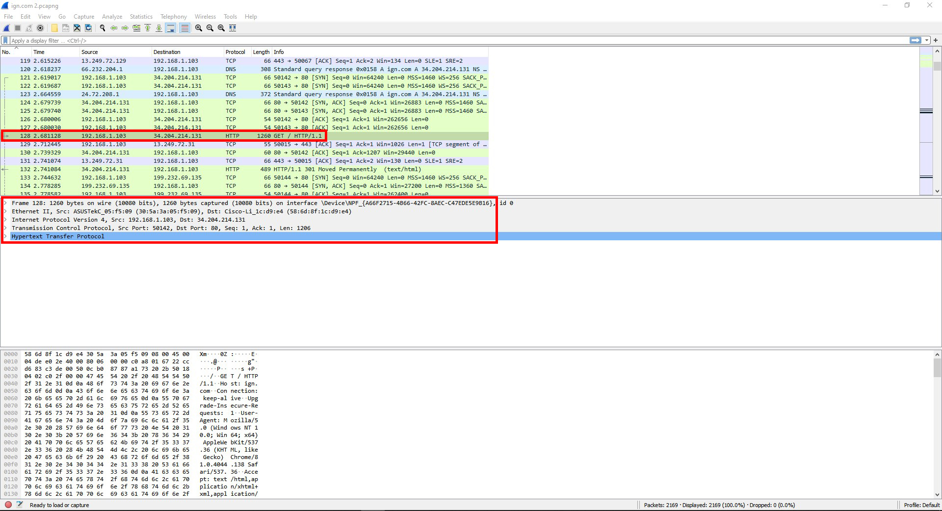 The protocol headers are HTTP, TCP, IPv4, Ethernet II, and Frame 128.