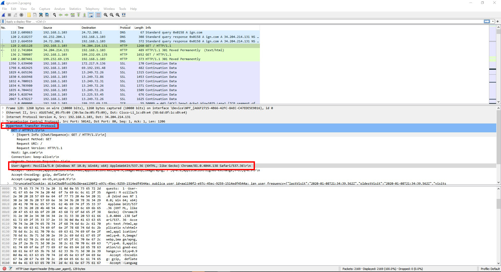 Question #7: Open the first frame carrying a HTTP GET request packet. What protocol headers do you see? List three field names from each of the headers. Within the HTTP header, find and record the User Agent information. Which layer does each of the protocols belong to?